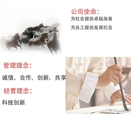 我公司一貫奉行"以科技為先導,市場為導向,管理為重點,效益為中心,質量為根本,誠信為命魂"的經營理念,以創名牌產品為突破口,用知識創新和業務創新提升企業的競爭力,以企業文化凝聚人心,走高起點,精產品、高效益之路,實現跨越式的發展,在新世紀,必將創造更加輝煌的成就,以優良的產品,真誠的服務奉獻于社會。